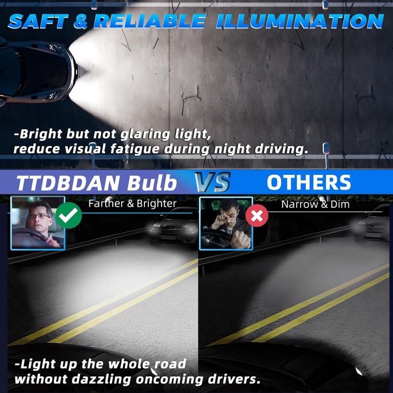 - 【300% Brighter & Power Saving】These Fusion headlight bulbs with new chips,luminous flux up to 1200 lumens per bulb.3 times brighter than original bulbs,6000k white perfect beam,excellent cut-off lines and perfect beam patterns.No black spots.No Flashing or Flickering.They also get a 80% power saving compared with original halogens.