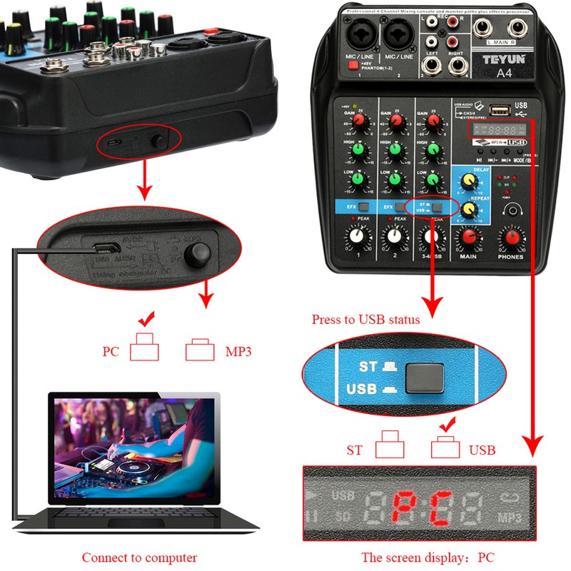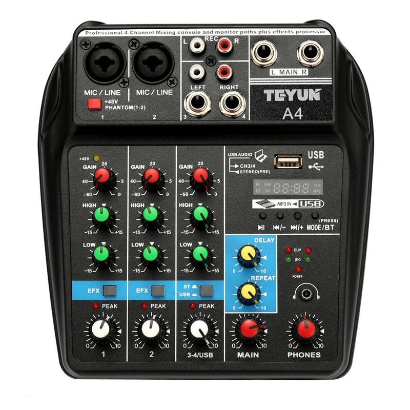 TU04 BT Sound Mixing Console Record 48V Phantom Power Monitor AUX Paths Plus Effects 4 Channels Audio Mixer with USB