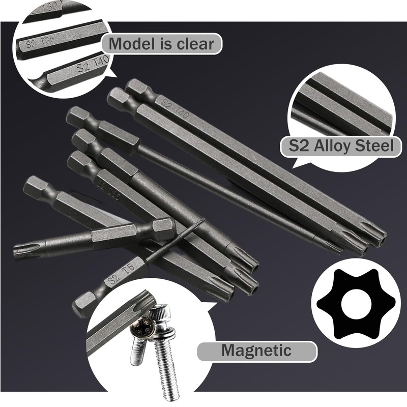 - ✅WHAT YOU RECEIVE: Professional multi size package, hexagonal handle on the edge of 6.35mm.75mm length. Size: T6,T7,T8,T9,T10,T15,T20,T25,T27,T30,T40 with Black Handle Use different sizes to screw, will damage screwdriver and the screw! Using the correct screwdriver bar, pay the less effort, and can easily unscrew the screws!