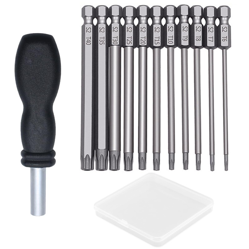 TUAKIMCE 11 PCS 100mm Torx Screwdriver Bits, T6-T40 S2 Steel 1/4 Inch Magnetic Star Torx Security Head Screwdriver Bits Set for Electric Manual Screwdrivers with Black Handle
