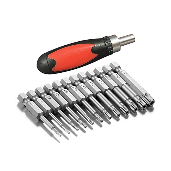 TUAKIMCE 12 Pcs Torx Head Screwdriver Bit Set, 50mm 1/4 inch Hex Shank T5-T40 S2 Steel Magnetic Star Torx Security Screwdriver Bits Set for Electric Manual Screwdrivers with 1 Pack Handle