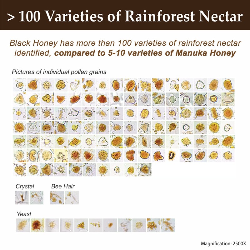 - It is estimated that every 10 grams of Black Honey contains more than 4.0 million pollen grains, being 40 times of Manuka Honey and other honeys.