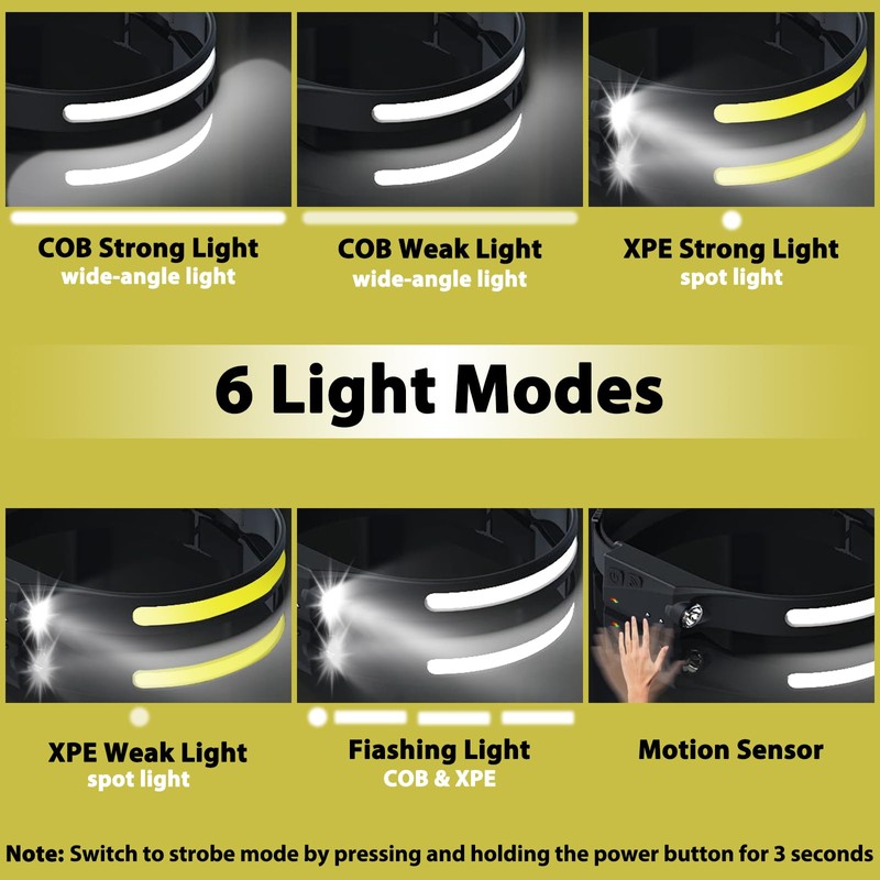 6 Adjustable Lighting Modes: Head lamps can switch between 6 different working modes - COB high mode, COB low mode, XPE high mode, XPE low mode and flashing mode. Pressing the power button, you can select the lighting mode of headlamps according to different usage scenarios, and long press to turn on the flashing mode.