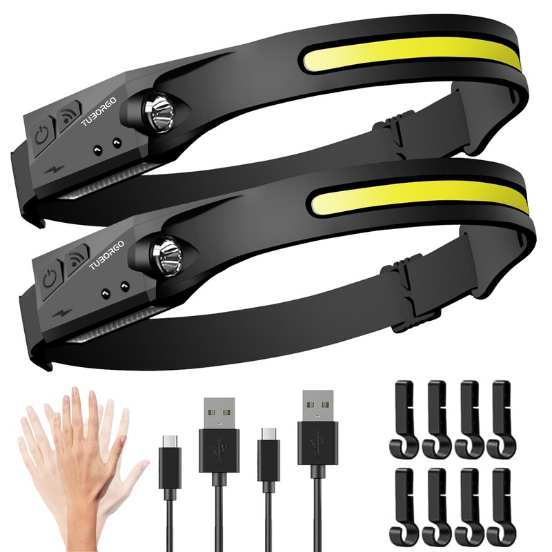 TUBORGO Headlamp Rechargeable 2PCS, 230° Wide Beam Head Lamp LED with Motion Sensor for Adults - Camping Accessories Gear, Waterproof Head Light Flashlight for Hiking, Running