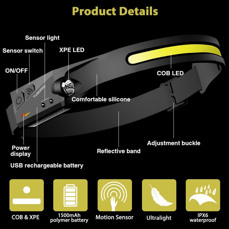 6 Adjustable Lighting Modes: Head lamps can switch between 6 different working modes - COB high mode, COB low mode, XPE high mode, XPE low mode and flashing mode. Pressing the power button, you can select the lighting mode of headlamps according to different usage scenarios, and long press to turn on the flashing mode.