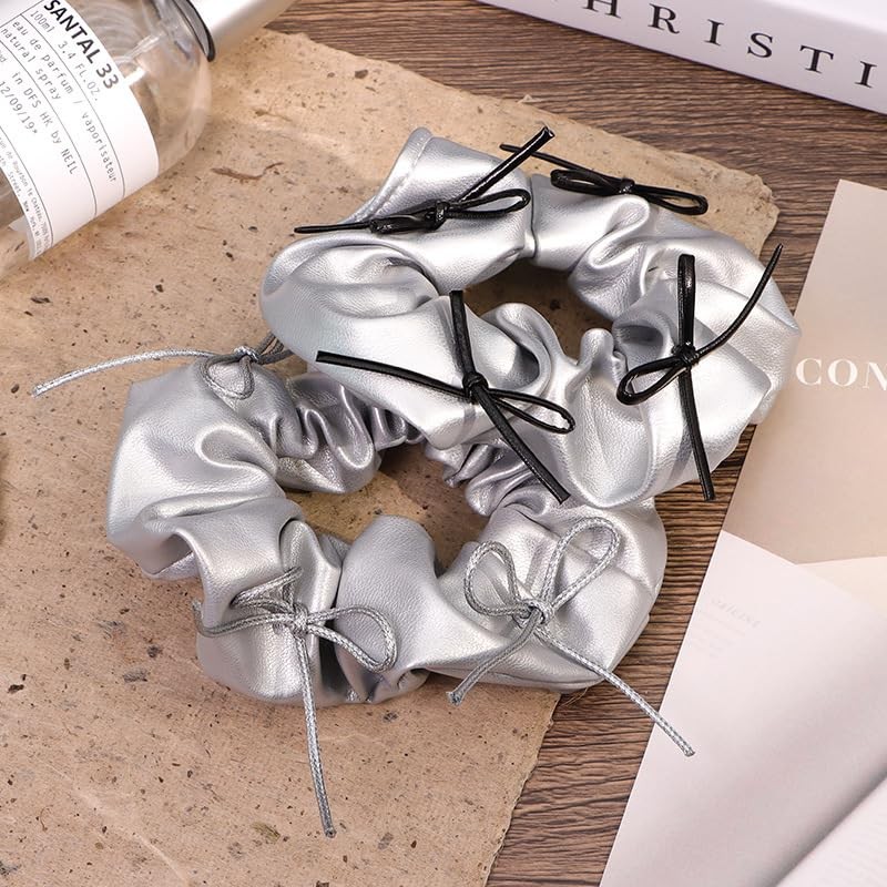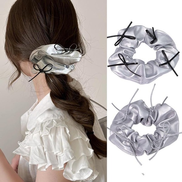 TUCEWP 2Pcs Scrunchies for Women PU Leather Cheer Hair Scrunchies Silver Ribbon Bowknot Hair Bands for Thick Hair Cute Bow Stretchy Hair Rope Fashion Hair Ponytail Holders Sweet Y2k Hair Accessories