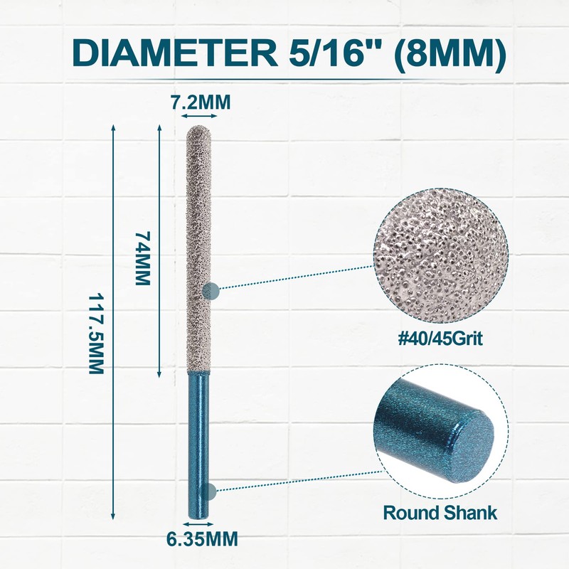 - Size: diameter 7.2mm, machinable length 74mm Round shank grit #45/50, total length 117.5mm.