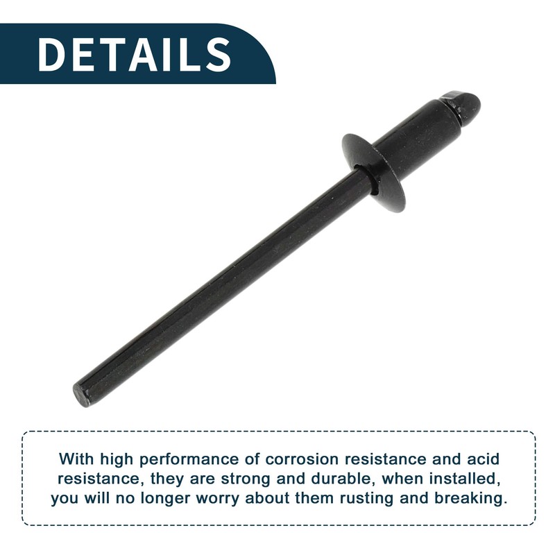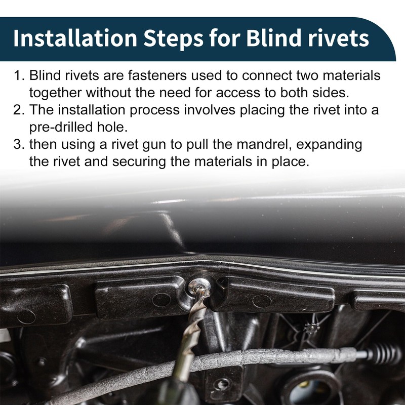 - Easy / Professional Installation:Installation Steps for Blind rivets: 1. Blind rivets are fasteners used to connect two materials together without the need for access to both sides. 2. The installation process involves placing the rivet into a pre-drilled hole, 3. then using a rivet gun to pull the mandrel, expanding the rivet and securing the materials in place.