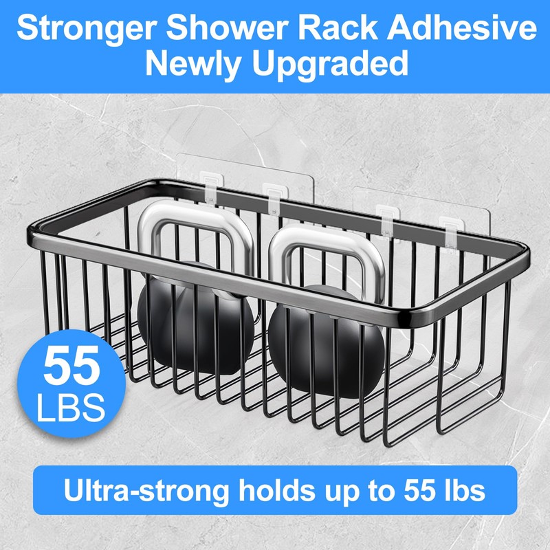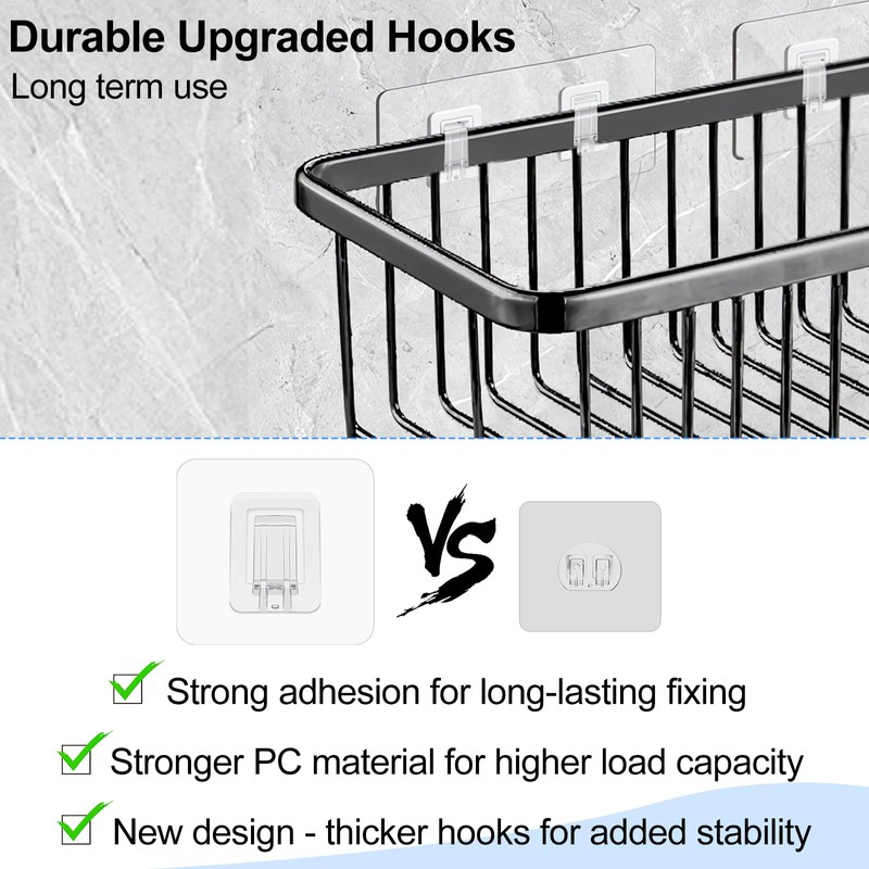 - High Quality: Our shower caddy adhesive replacement is made of high-grade PC material, non-toxic and odorless, no drilling. Durable upgraded thickened hooks, strong adhesion and can hold up to about 55 lbs.