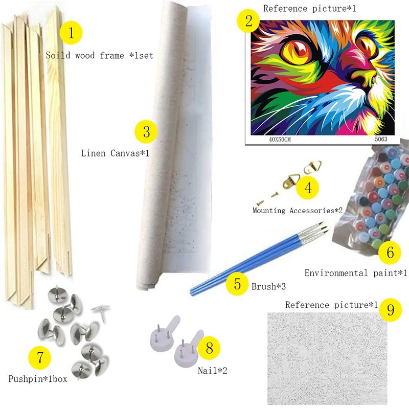 - What You Get:A set of digital paintings BY TuCocoo,which include 1pcs canvas to be painted with DIY framed(Canvas Size:16x20 Inch/40x50cm), 1 set of acrylic pigment colors and 3 different size brushes.