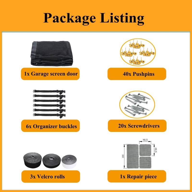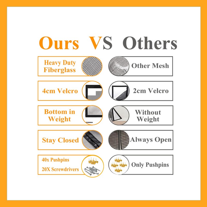- UPGRADE VERSION: We upgrade the top Velcro of the retractable screen door to 4CM, no worry about garage magic mesh falling down, increase the bottom weight of the screen doors, wind-proof, no need to organise the door net screen with magnet frequently, you can focus on what you are doing. We pack 20pcs of screws for the Self Sealing Fiberglass Mesh, if your garage door frame is smooth, you can use the screws to hold the Magnetic Garage Door Screen.