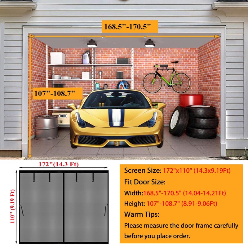 - WARM TIPS: Our Screen doors fit for 14x9ft garage door, please make sure your size. IMPORTANT: Measure your garage twice before you place order.