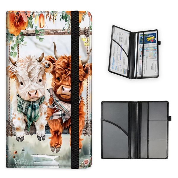 Tudguiloae Car Registration and Insurance Card Holder, Trunk Document Holder Organizer, Essential Vehicle Glove Box Organizer Leather Wallet or Driver, Cute Highland Cows