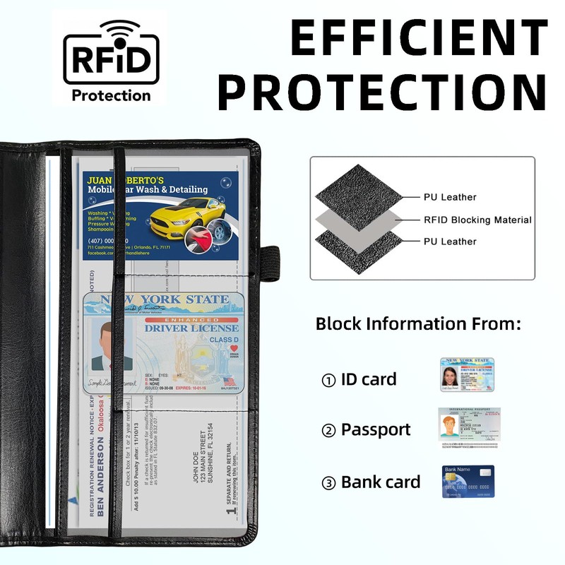 - RFID Protection: RFID blocking car document organizer - protects credit cards IDs from electronic theft, secure shielding technology, anti-skimming wallet for drivers, safeguards personal information