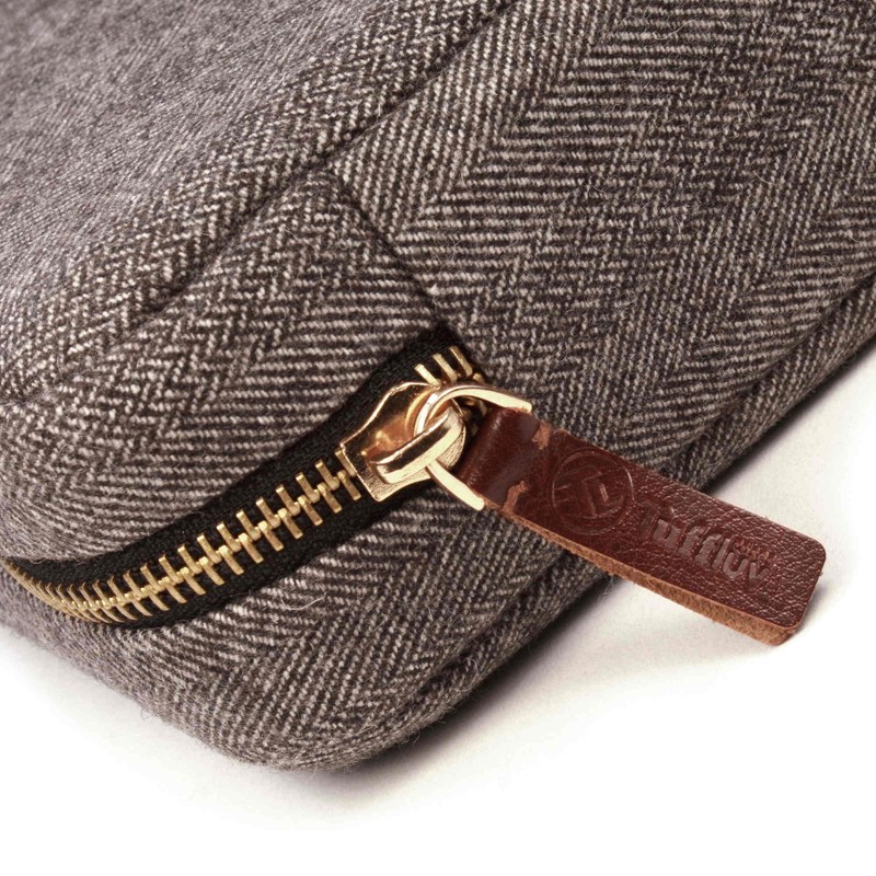 - Various pockets designed to hold charger and cables. Full length zip access with luxurious leather zipper pulls in brown color complement the tweed patterning and divider cushions storage while in transit.