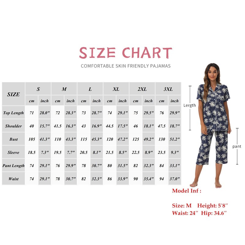 - 【WARM TIPS & SERVICE】Machine washable, washing max 40℃, low iron, tumble dry low heat and do not bleach. ATTENTION: this pajamas sets is slim fit design and fabric without any stretchy, If you like the loose fitted, please ORDER ONE SIZE UP. If you have any problem with the capri pajamas set, rest assured that we will do everything we can to make it right.