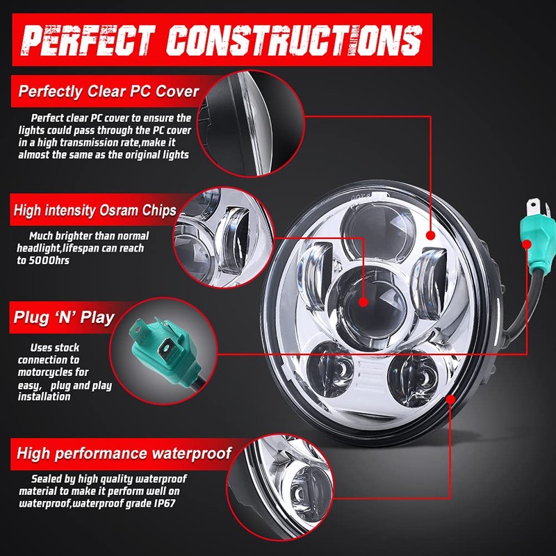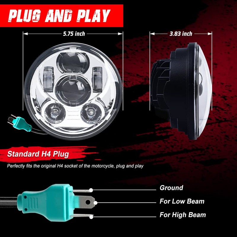 - Original OSRAM LED chip 5.75" motorcycle headlight assembly, high beam 4000Lms, low beam 2800Lms, color temperature 6500K