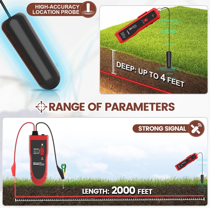 - SAVE TIME AND MONEY - Using an underground wire locator wire tracer electrical is a great way to save time and money; You will save a lot of maintenance costs by underground wire tracer and an electrical wire finder in the wall; A buried wire cable locator can help you locate and track buried and hidden cables, eliminating the need to dig up the ground to find and repair them yourself; As well as reducing the environmental impact of digging up the ground