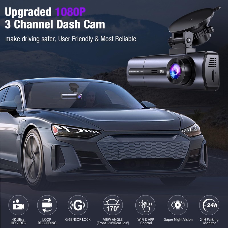 - HD 3-Channel WiFi Dash Cam: The J10 dash cam monitors your car’s front and rear, and inside in 4K/2.5K+1080P+1080P resolution, providing all-around surveillance and ensuring high-definition coverage from every angle. Whether it's day or night, the J10 dash cam helps you feel secure on the road with continuous, high-quality video recording. The front is 170 degrees and the rear is 120 degrees, effectively reducing blind spots and giving you greater peace of mind during your journey.