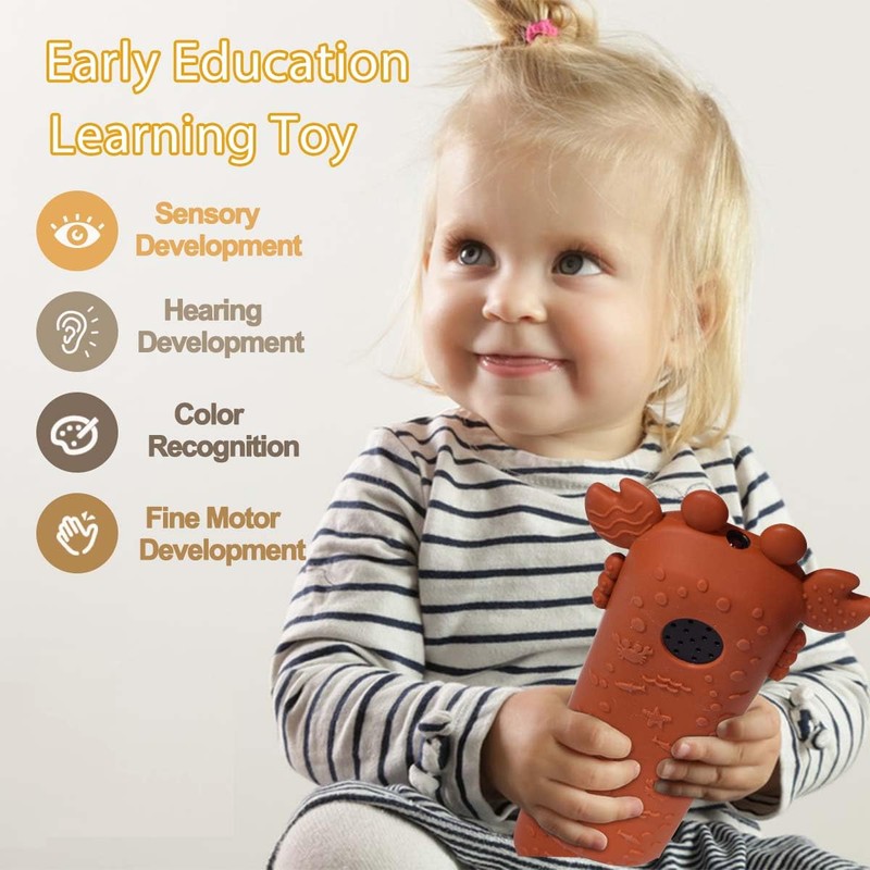 - [Teether & Sensory Toy]--Remote control design with a cute soft silicone crab cover, because baby like put something into mouth, this remote control also can be a teether toy. Back of the cover have some cartoon textured shape, can help baby's sensory develop and stimulate the baby's skin for tactile exploration.