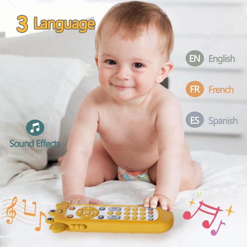 - [Language Enlightenment Remote Control]--The musical TV remote control with 3 language: English/French/Spanish. Baby will start early language learning through playing this muilt function remote. Learn different languages while playing.