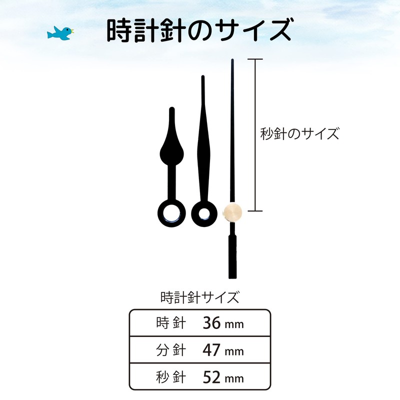 • Watch hand size: Hour hand: 1.4 inches (36 mm), minute hand: 1.9 inches (47 mm), Second hand: 2.0 inches (52 mm), Shaft length: 0.6 inches (16 mm) (screw part: 0.3 inches (8 mm)