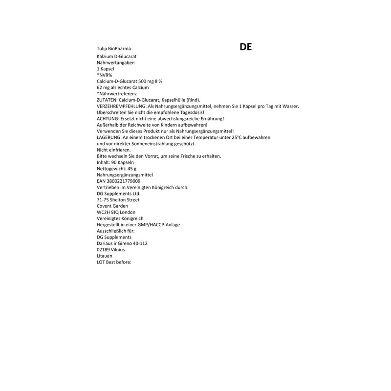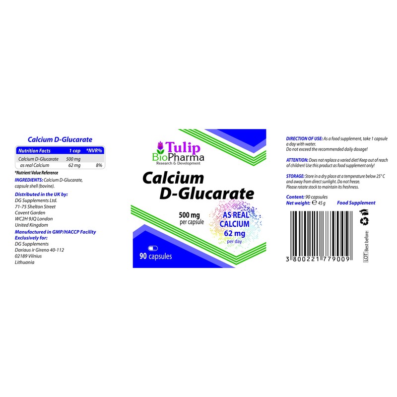 Product descriptionCalcium D-Glucarate 500mg 90 CapsulesIngredientsCalcium D-Glucarate, capsule shell (bovine).DirectionsAs a dietary supplement take 1 capsule daily, preferably with a glass of water. Recommended daily intake (1 capsule) contains Calcium D-Glucarate 500mg (as real Calcium 62mg) . Each bottle contains 90 capsules. 3 Month supply