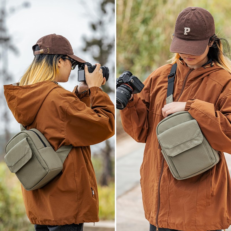 - Compact Travel Bag - Choose this camera shoulder bag when you hate to take a large camera bag with lots of equipment. This sling bag fit 1 camera and one or two lens and other accessories such battary, memory card etc. It's lightweight portable suitable for street photography,outdoor travel, commuting or short trip. It's also can be a leisure bag purse for daily use.