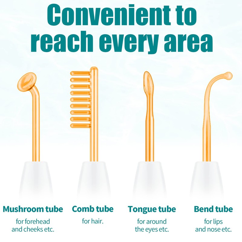 - 4 glass tubes in different shapes for multiple use: TUMAKOU high-frequency rod face comes with a set of 4 glass tubes in different shapes for all your needs. Mushroom tubes for a wide area to reduce wrinkles such as cheeks, forehead and chin. Tubes for acne and blemishes to reduce their appearance. Curved tube for sensitive areas such as dark circles, nose or lips. Hair growth comb tube