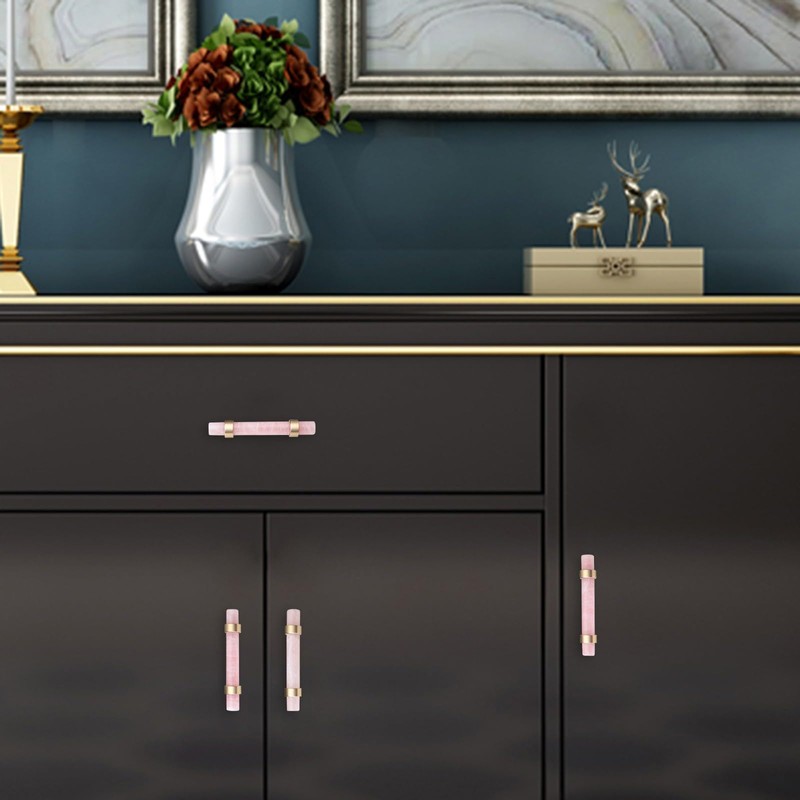 TUMBEELLUWA Pack of 2 Cylindrical Crystal Cabinet Knobs Polished Stone Pulls Brass Handles Hardware for Dresser Wardrobe Drawer Cupboard, Rose Quartz