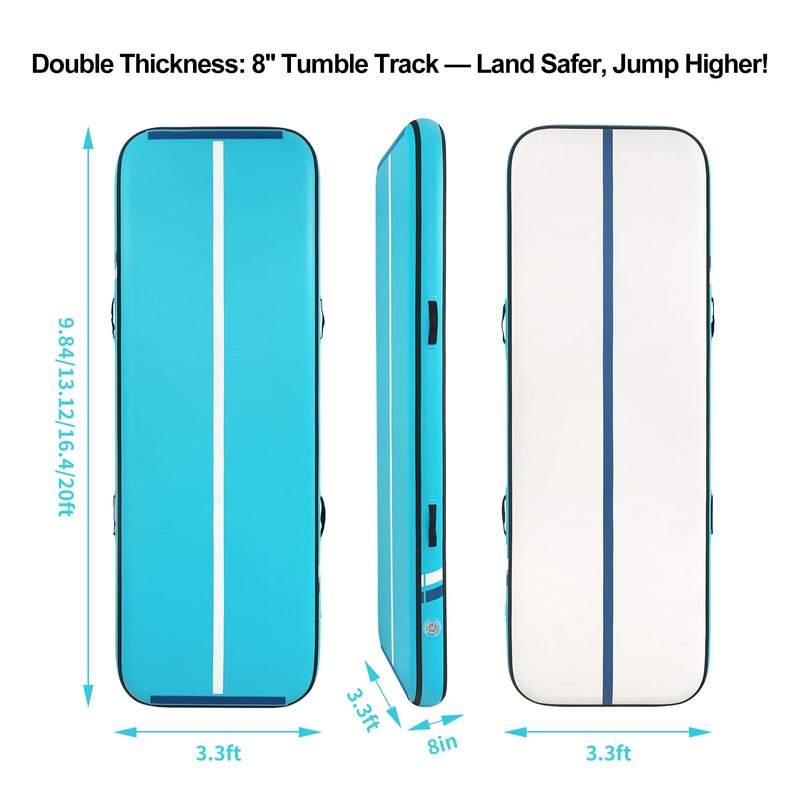 - High Quality & Durability: The gymnastics mat is made of 1000D high-strength double-wall material and 0.9mm premium PVC waterproof tarpaulin, ensuring excellent air-tightness and durability. Whether used for training or performance, the tumble track features reinforced seams for long-term use without air leaks. The material is eco-friendly and odor-free, making it both safe and reliable