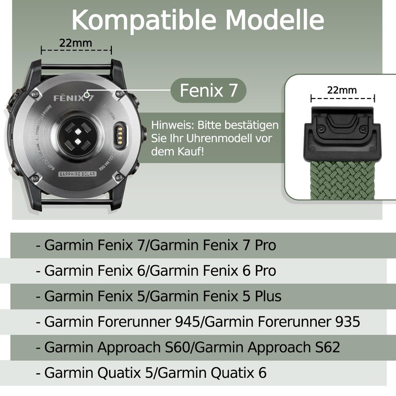 - Compatible models: TumCez braided nylon bracelet compatible with Garmin Fenix 8 47 mm/Garmin Fenix E 47 mm/Garmin Fenix 7/Garmin Fenix 7 Pro/Garmin Fenix 6/Garmin Fenix 6 Pro/Garmin Fenix 5/Garmin Fenix 5 Plus; Garmin Forerunner 945/Garmin Forerunner 935; Garmin Approach S60/Garmin Approach S62. ; Garmin Quatix 5/Garmin Quatix 6.