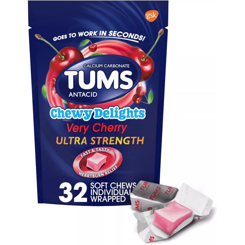 • Contents: 1 resealable bag containing 32 individually wrapped TUMS Chewy Delights Ultra Strength Antacid Soft Chews for Chewable Heartburn Relief and Acid Indigestion Relief in an easy to take, delicious Very Cherry flavor