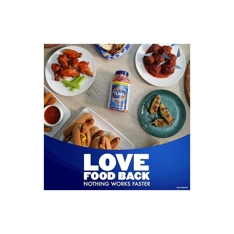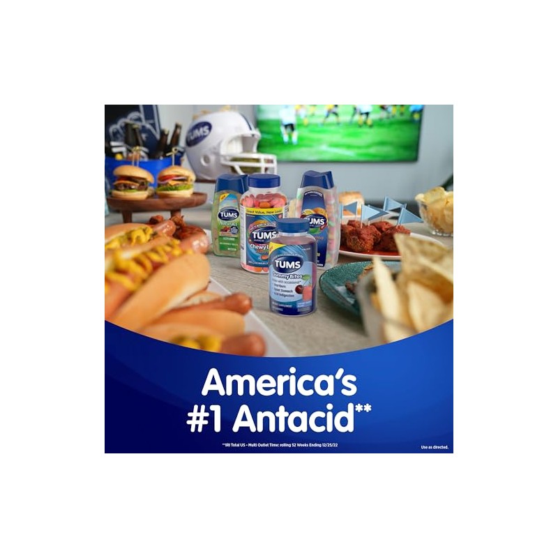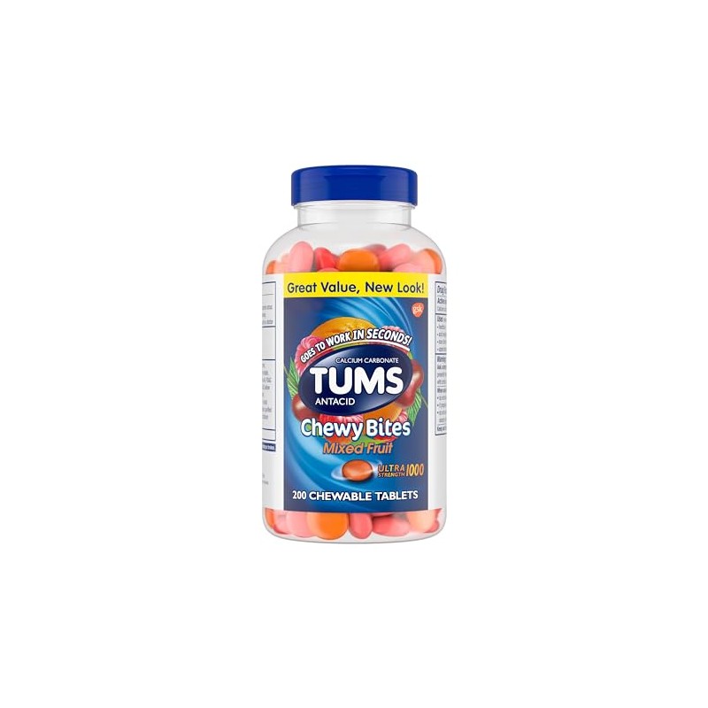 TUMS Chewy Bites Ultra Strength Chewable Antacid Tablets go to work in seconds for delicious, chewable heartburn relief. Perfect for a summer BBQ or outdoor grilling, TUMS Chewy Bites Ultra Strength Chewable Antacid Tablets offer fast relief from heartburn caused by spicy barbecue, grilled chicken, and other cookout cuisines. When symptoms occur, take two to three chewable antacids, depending on the severity of your acid indigestion. Featuring the active ingredient calcium carbonate, these chewy antacid tablets provide heartburn, sour stomach and acid indigestion relief, as well as upset stomach relief associated with these symptoms. Each chewable tablet delivers fast relief in every bite. With a delicious outer shell and soft center, TUMS Mixed Fruit tablets come in three delicious flavors. TUMS antacid tablets are the number 1 recommended adult antacid brand by doctors, pharmacists and Ob-Gyns. As America's number 1 antacid and trusted as a heartburn medicine for 90 years, TUMS is fully supported with a satisfaction guarantee. These ultra strength heartburn relief tablets come in a compact, recyclable bottle that's easy to stow for whenever heartburn strikes. With TUMS Chewy Bites, you get tasty, fast acting heartburn relief in every chewy bite.