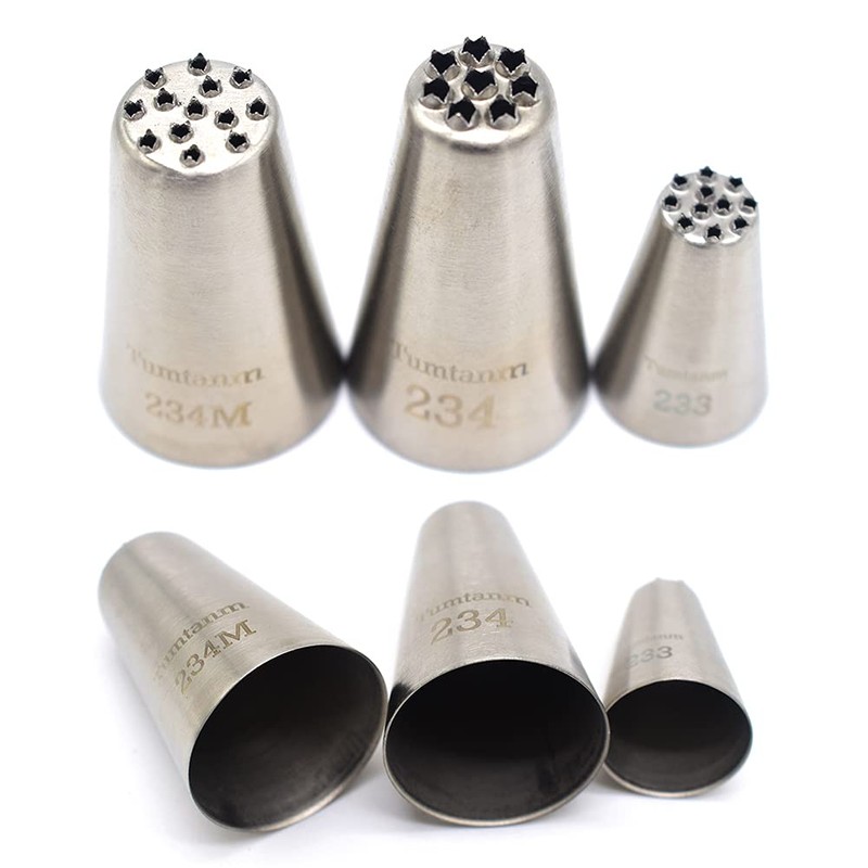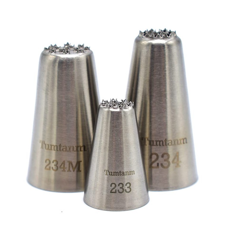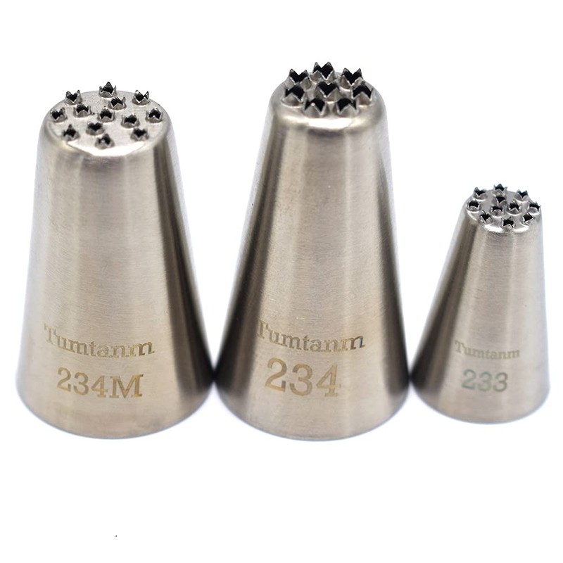 Tumtanm #234M #234 #233 piping Icing tips.These icing tips simply screw onto Tumtanm decorating icing pouches or tubes and make it easy for you to create great looking designs on your cakes in minutes. This package contains one decorating tip made of 304 Seamless stainless steel. Dishwasher safe. Package Contains 3 x Large Drop Flower Piping Tip
