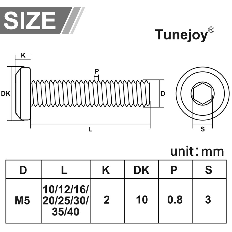 • Specifications: 20 pieces M5 x 40 mm flat head screws. Head Shape: Flat Head Drive Type: Hex Socket Equipped with an Allen key to meet daily needs