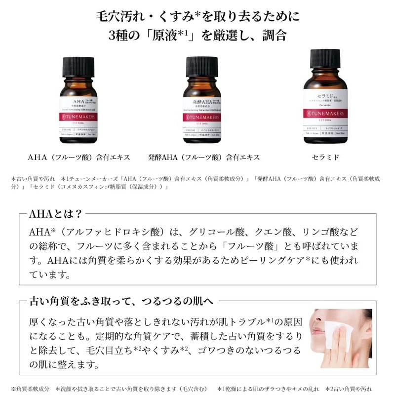 The developer who knows the characteristics of Tune Makers solution, carefully selected the undiluted solution necessary to remove blackheads and dulling pores and is formulated with a unique ratio. Formulated with two types of "AHA (fruit acid) extract that softens the skin, and "ceramide" undiluted solution for removing blackheads and dulling of pores. Removing old exfoliating accumulates prevents skin rashes and leaves skin smooth and clear.