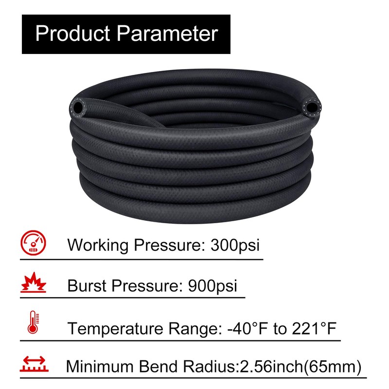 - Material: Made of NBR inner, NBR+PVC outer, reinforced with polyester fiber braid.