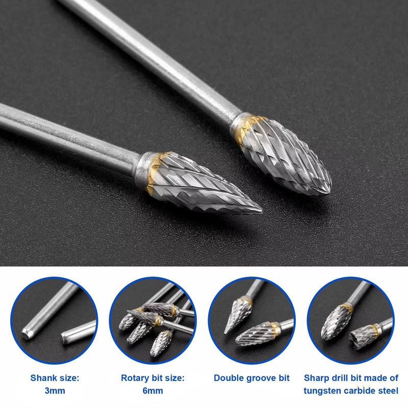Tungsten Carbide Burr Set 1/8" Shank Single Flute Rotary Bits for Metalworking Wood Carving Grinding Engraving Tools