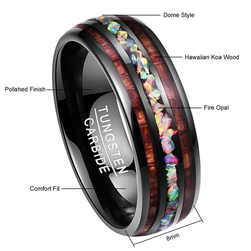 - Crushed fire created-opal and Hawaiian koa wood inlay set on the dome style tungsten carbide band