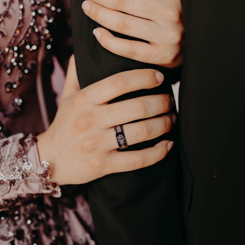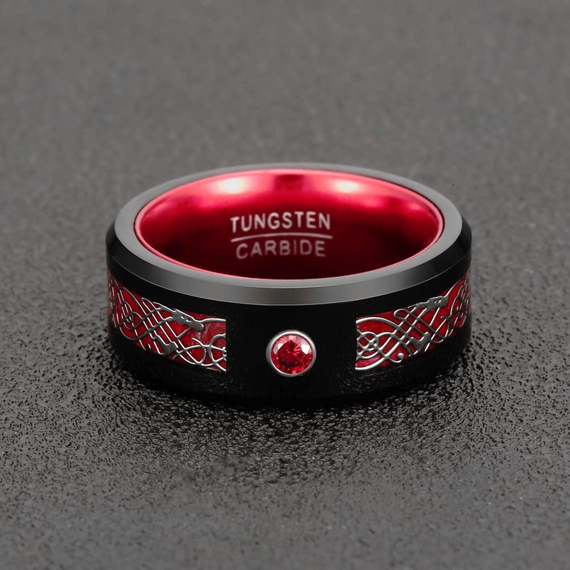 - Design: Tungsten carbide ring with unique celtic dragon pattern, red carbon fiber and cz inlay
