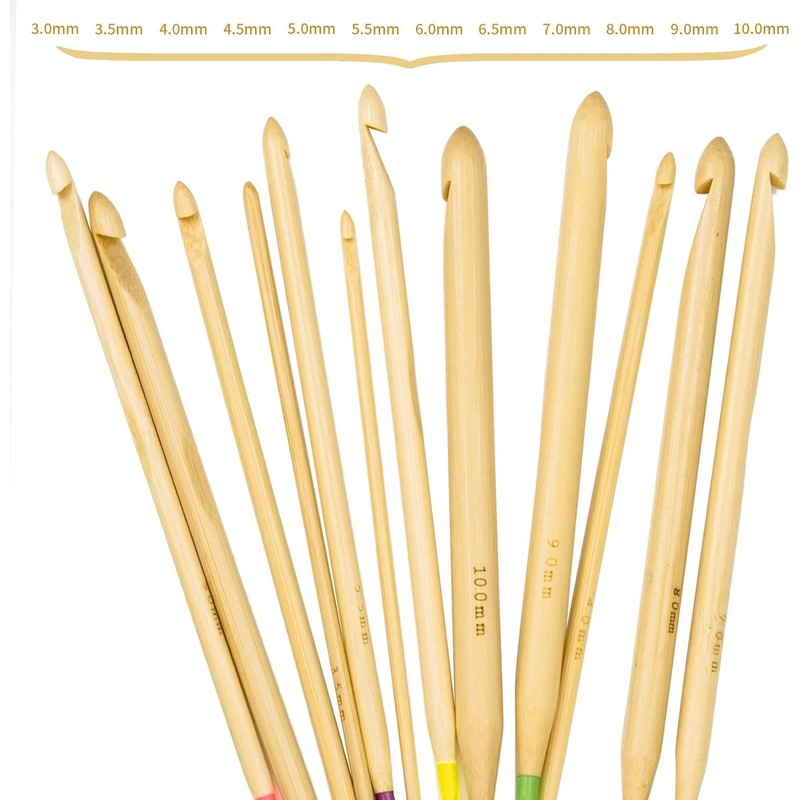 - 12 size bamboo crochet hooks: 3.0 mm, 3.5 mm, 4.0 mm, 4.5 mm, 5.0 mm, 5.5 mm, 6.0 mm, 6.5 mm, 7.0 mm, 8.0 mm, 9.0 mm, 10.0 mm with 1.2 m length.