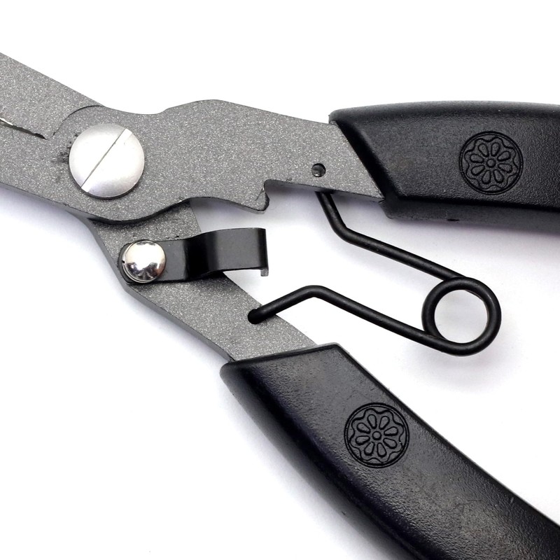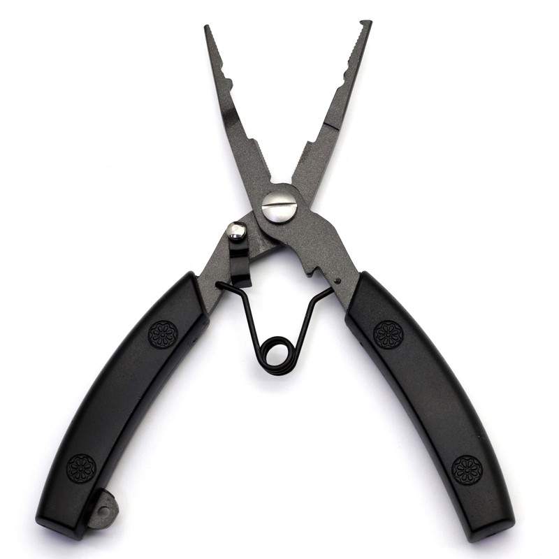 - Split ring opener (#3-#6 split ring recommended), serrated blade line cutter (compatible with nylon, fluoro and PE), lock part that can be opened and closed with one hand, sleeve cuffs, end rope and lanyard mounting holes