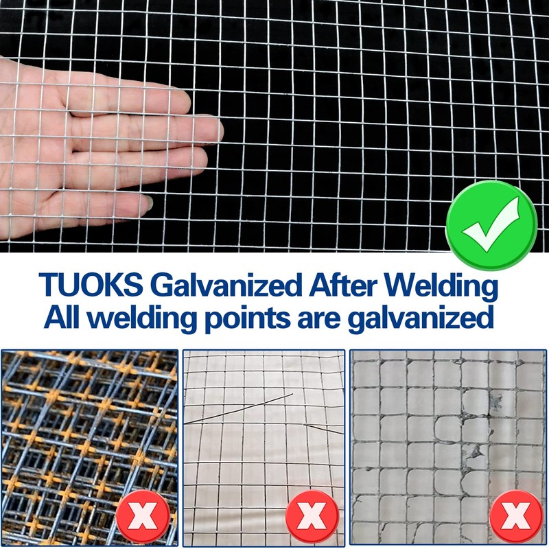 - 【STURDY MATERIAL】 Unlike other hardware cloth products, TUOKS hardware cloth 1/4 inch 48'' x 100' is made of sturdy and flexible low carbon steel wire and processed by automated equipment which is precise and ensure that all solder joints are coated with zinc. TUOKS heavy-duty hot-dip galvanized wire mesh roll provides optimal strength, wear and rust resistance, easy installation and long service life.