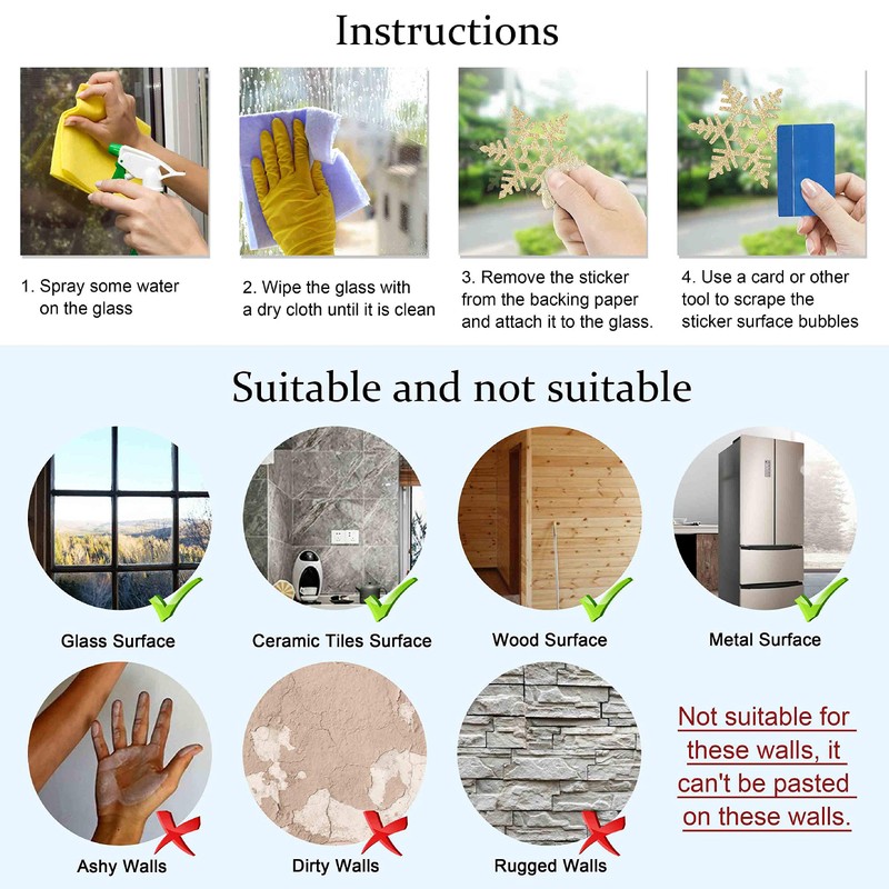 - ❤️ Static cling means no adhesive, just a fine spray of water to apply which means no lasting damage to your windows and your window clings can be moved easily and re-used next year. It can be applied to any smooth , clean and dry surface. water resistant, double sided visual design.Please note it cannot be used in warm place,the heat may cause them to shrunk or peel