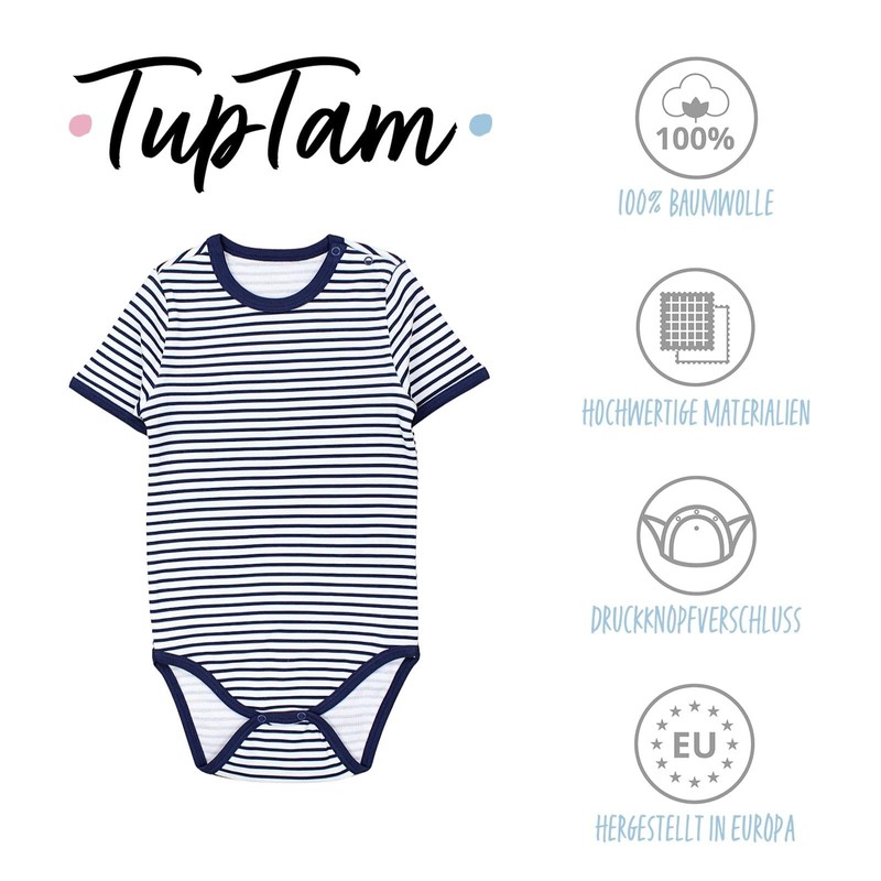 These super comfortable children's short-sleeved bodysuits from TupTam are available in an advantageous pack of 3. The cuddly soft, skin-friendly fabric made of cotton ensures a first-class feel and optimal breathability. The practical onesie has two press studs in the crotch and on the shoulder for easy removal. The universal colour choice is suitable for both girls and boys alike. The set consists of 1 bodysuit in dark blue and 2 bodysuits with great striped pattern (1 x dark blue, 1 x grey). The things stay bright and fresh for a long time and even after repeated washing, the good fit remains unchanged. A basic body that is indispensable in a children's laundry cabinet. Made in the EU with great attention to detail.