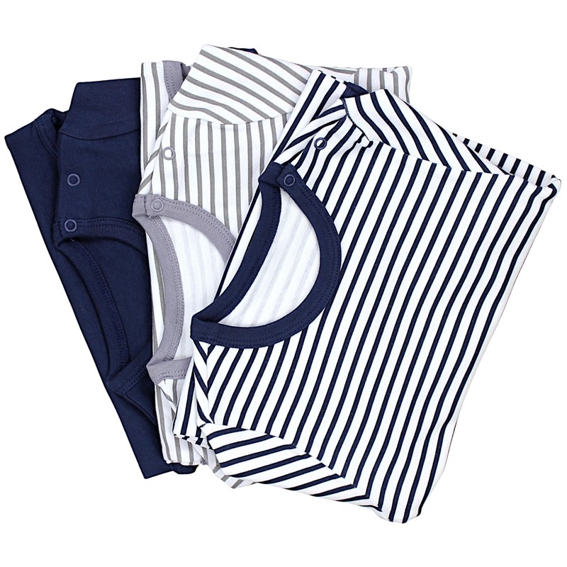 - Timeless unisex design - 1 bodysuit in dark blue and 2 with stripes (dark blue, grey) - colours remain fresh and radiant even after many washes.