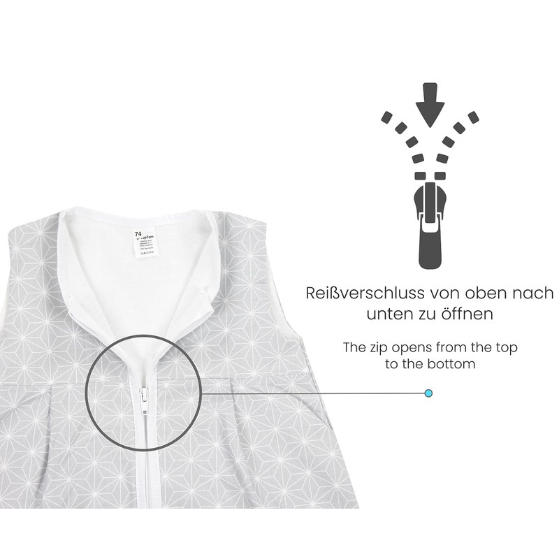 The TupTam baby summer sleeping bag is made from carefully selected, high-quality cotton and is made from Oeko-Tex certified materials (Oeko-Tex Standard 100 certificate number IW00180 and IW00266). It meets the highest standards in terms of safety and health safety for your baby. Made in the EU. With a tog value of 0.5, this sleeping bag ensures optimal air circulation and thus ensures a comfortable sleep during warm nights above 22 degrees room temperature. Inside, this model is equipped with a cuddly soft, thin flannel that repels moisture. So that your baby feels born and comfortable at all times. All our sleeping bags are very easy to care for quick and stress-free cleaning. Thanks to the possible machine wash at 40 degrees on a gentle cycle, cleaning this sleeping bag is a breeze. So you always have a hygienic sleeping bag for your baby at hand.