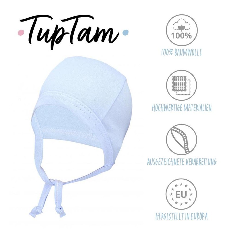 This beautiful newborn hat with ties from the children's brand TupTam is perfect for the first months of your baby’s life. Made from a skin-friendly cotton fabric. The soft cotton feels comfortable and ensures optimal breathability. Carefully crafted and high-quality materials ensure a perfect fit and optimal comfort. Practical ties ensure a perfect fit and the right position on the baby's head. The cute bonnets are available in an attractive set of 2 and come in the following colours: blue, grey, pink and white. They are undoubtedly part of baby’s first outfit. Made in the EU with great attention to detail.