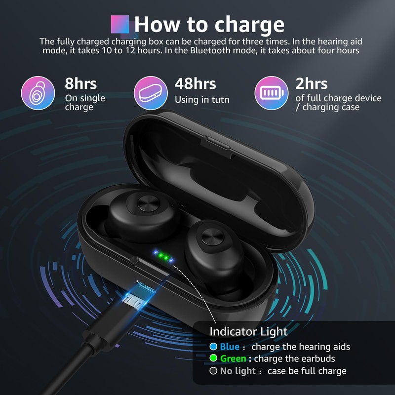 - Convenient Charging: The hearing aids come with a portable charging case that allows you to recharge them anytime, anywhere. The charging case uses a USB cable for charging, and the hearing aids take approximately 2-3 hours to fully recharge. Once fully charged, they provide around 24 hours of continuous usage. This convenient charging feature eliminates the need for frequent battery replacements, saving time and cost.